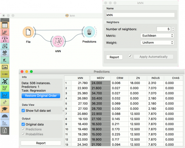 Widget kNN menggunakan algoritma kNN yang akan mencari k instance training terdekat di ruang feature dan menggunakan rata-rata feature terdekat tersebut untuk mem-prediksi.
