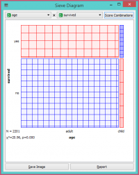 The snapshot below shows a sieve diagram for the Titanic dataset and has the attributes sex and survived (the latter is a class attribute in this dataset). The plot shows that the two variables are highly associated, as there are substantial differences between observed and expected frequencies in all of the four quadrants. For example, and as highlighted in the balloon, the chance for surviving the accident was much higher for female passengers than expected (0.06 vs. 0.15). | The snapshot below shows a sieve diagram for the Titanic dataset and has the attributes sex and survived (the latter is a class attribute in this dataset). The plot shows that the two variables are highly associated, as there are substantial differences between observed and expected frequencies in all of the four quadrants. For example, and as highlighted in the balloon, the chance for surviving the accident was much higher for female passengers than expected (0.06 vs. 0.15). | ||