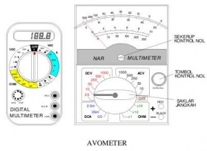 Alat lain yang harus tersedia pada meja kerja adalah AVOMETER atau sering disebut pula multimeter. Fungsi utamanya adalah untuk mengukur Ampere, Voltage dan OHM (resistansi). | Alat lain yang harus tersedia pada meja kerja adalah AVOMETER atau sering disebut pula multimeter. Fungsi utamanya adalah untuk mengukur Ampere, Voltage dan OHM (resistansi). | ||