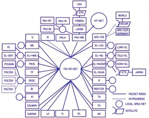 Pada gambar diperlihatkan topologi jaringan Internet di ITB pada bulan November 1994. Sebagian besar masih menggunakan teknologi radio paket dengan walkie talkie kecepatan 1,2Kbps (1200bps) saja.