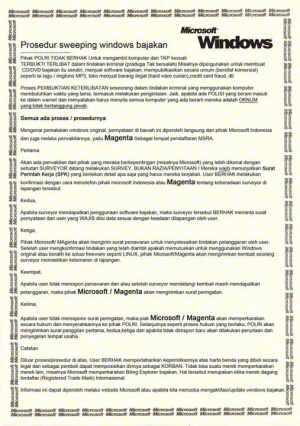 Berikut ini adalah prosedur yang perlu diketahui jika terjadi sweeping mengenai Windows Bajakan "Pihak POLRI TIDAK BERHAK Untuk mengambil komputer dari TKP kecuali TERBUKTI TERLIBAT dalam tindakan kriminal (praduga Tak bersalah) " Misalnya dipergunakan untuk membuat CD/DVD bajakan itu sendiri, menjual software bajakan, mempubilkasikan secara umum (bersifat komersial) seperti isilagu/ringtone MP3, toko menjual barang ilegal (hard ware curian), credit card fraud, dll.