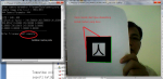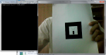 Posisikan pola baru yang akan dilatih dalam kondisi pencahayaan yang sama seperti ketika aplikasi tersebut akan dijalankan. Kemudian arahkan kamera video ke pola gambar yang baru dibuat, dan atur hingga persegi merah dan hijau muncul di sekitar pola (seperti pada gambar ). Hal ini menunjukkan bahwa software applikasi mk_patt telah menemukan kotak persegi di sekitar pola yang dites. Kemudian gambar di atur agar sudut merah dari persegi yang disorot adalah sudut kiri atas pada gambar di video, seperti pada gambar. Setelah kotak pola telah ditemukan dan orientasinya benar, tekan tombol kiri mouse, kemudian kita akan diminta untuk memberikan nama file pada pola yang baru kita buat. Ketikkan nama file seperti patt.newpola | Posisikan pola baru yang akan dilatih dalam kondisi pencahayaan yang sama seperti ketika aplikasi tersebut akan dijalankan. Kemudian arahkan kamera video ke pola gambar yang baru dibuat, dan atur hingga persegi merah dan hijau muncul di sekitar pola (seperti pada gambar ). Hal ini menunjukkan bahwa software applikasi mk_patt telah menemukan kotak persegi di sekitar pola yang dites. Kemudian gambar di atur agar sudut merah dari persegi yang disorot adalah sudut kiri atas pada gambar di video, seperti pada gambar. Setelah kotak pola telah ditemukan dan orientasinya benar, tekan tombol kiri mouse, kemudian kita akan diminta untuk memberikan nama file pada pola yang baru kita buat. Ketikkan nama file seperti patt.newpola | ||