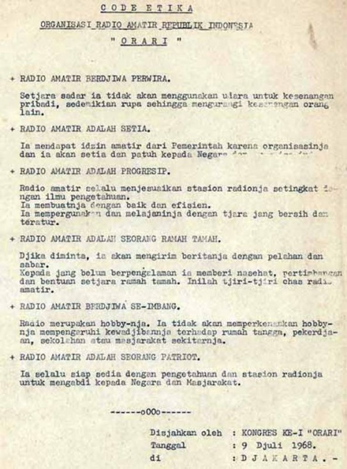 [[Image:Kode-etik-amatir-radio-1968.jpg| | [[Image:Kode-etik-amatir-radio-1968.jpg|center|500px|thumb|Naskah Kode Etik Amatir Radio 1968 - Kode Etik Amatir Radio Indonesia pertama kali di sjahkan pada tanggal 9 Juli 1968 di Kongres Pertama ORARI di Jakarta]] | ||
