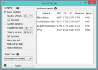 The widget tests learning algorithms. Different sampling schemes are available, including using separate test data. The widget does two things. First, it shows a table with different classifier performance measures, such as classification accuracy and area under the curve. Second, it outputs evaluation results, which can be used by other widgets for analyzing the performance of classifiers, such as ROC Analysis or Confusion Matrix.
