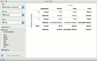 We have selected Count and Majority as aggregation methods. In the pivot table, we can see the number of instances that do not have diameter narrowing and are female. There are 72 such patients. Concurrently, there are 92 male patients that don’t have diameter narrowing. Thal values don’t have any effect here, we are just counting occurrences in the data. | We have selected Count and Majority as aggregation methods. In the pivot table, we can see the number of instances that do not have diameter narrowing and are female. There are 72 such patients. Concurrently, there are 92 male patients that don’t have diameter narrowing. Thal values don’t have any effect here, we are just counting occurrences in the data. | ||