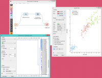 Pada contoh kedua, kami me-load dataset Iris lagi, tetapi kali ini kita menambahkan Widget Scatter Plot, menampilkan semua instance dari widget File, sementara pada saat yang sama menerima sinyal instance yang dipilih dari Hierarchical Clustering. Dengan cara ini kita dapat mengamati posisi cluster yang dipilih dalam proyeksi. | |||