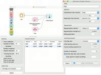 Widget Stochastic Gradient Descent menggunakan stochastic gradient descent yang akan meminimalkan loss function terpilih dengan fungsi liniar. Algoritma akan mengira-ngira gradient yang benar dengan mempertimbangkan satu sampel pada satu waktu, dan secara bersamaan memperbarui model berdasarkan pada gradien dari loss function. Untuk regression, dia akan memberikan predictor sebagai minimizers of the sum, yaitu, M-estimators, dan sangat bermanfaat untuk dataset large-scale dan sparse. | |||