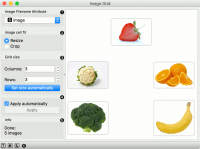 Widget Image Grid dapat digunakan untuk visualisasi image dalam projeksi 2D. Dalam contoh ini, kita menggunakan 5 image dari buah-buahan dan sayuran, yaitu, jeruk (orange), pisang (banana), strawberry, brokoli (broccoli) dan kol (cauliflower). Image di load menggunakan Widget Import Images dan meng-embed dengan Inception v3 embedder di widget Image Embedding. Akhirnya, kita mem-visualiasikan image di Widget Image Grid. Akan terlihat bahwa broccoli dan cauliflower akan lebih mirip ke strawberry daripada pisang (banana).