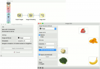 Widget Image Grid dapat digunakan untuk visualisasi image dalam projeksi 2D. | Widget Image Grid dapat digunakan untuk visualisasi image dalam projeksi 2D. Dalam contoh ini, kita menggunakan 5 image dari buah-buahan dan sayuran, yaitu, jeruk (orange), pisang (banana), strawberry, brokoli (broccoli) dan kol (cauliflower). Image di load menggunakan Widget Import Images dan meng-embed dengan Inception v3 embedder di widget Image Embedding. Akhirnya, kita mem-visualiasikan image di Widget Image Grid. Akan terlihat bahwa broccoli dan cauliflower akan lebih mirip ke strawberry daripada pisang (banana). | ||