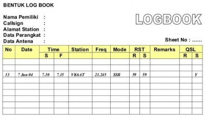 Log book adalah merupakan catatan harian tentang kegiatan komunikasi radio yang dilakukan. Fungsi Logbook adalah : | Log book adalah merupakan catatan harian tentang kegiatan komunikasi radio yang dilakukan. Fungsi Logbook adalah : | ||