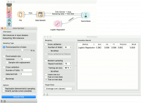 Then we connected two outputs to the Test & Score widget, Data Sample –> Data and Remaining Data –> Test Data. Finally, we added Logistic Regression as the learner. This runs logistic regression on the Data input and evaluates the results on the Test Data.