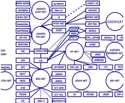 Pada Gambar diperlihatkan topologi jaringan Internet di Indonesia pada bulan November 1994. Sebagian besar sambungan masih menggunakan teknologi radio paket pada kecepatan 1,2Kbps (1200bps) saja. Banyak sambungan terutama yang berlokasi di Bandung tersambung menggunakan Walkie Talkie pada band 2 meter-an.