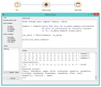 Widget Python Script dapat digunakan untuk menjalankan skrip python di input, ketika fungsionalitas yang sesuai tidak diterapkan dalam widget yang ada. Script memiliki variabel in_data, in_distance, in_learner, in_classifier dan in_object (dari sinyal input) di namespace lokalnya. Jika sinyal tidak terhubung atau belum menerima data apa pun, variabel tersebut akan berisi None.