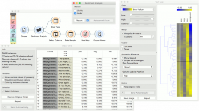 Widget Sentiment Analysis dapat digunakan untuk membangun feature tambahan dengan prediksi sentimen dari corpus. Untuk mencoba ini, kita load Election-2016-tweets.tab menggunakan widget Corpus. Kemudian sambungkan widget Corpus ke widget Sentiment Analysis. Widget Sentiment Analysis akan menambahkan 4 feature baru dari Vader method: positive score, negative score, neutral score dan compound (combined score).