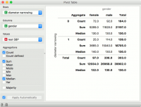 Widget Pivot Table merangkum data dari tabel yang lebih luas ke dalam tabel statistik. Statistik dapat mencakup jumlah, rata-rata, jumlah, dll. Widget ini juga memungkinkan pemilihan subset dari tabel dan pengelompokan berdasarkan nilai baris, yang harus berupa variabel diskrit. Data dengan hanya variabel numerik tidak dapat ditampilkan dalam tabel.
