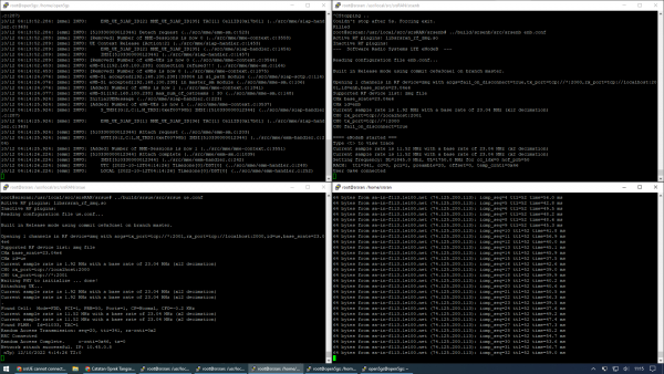 CStopping .. Couldn't stop after 5s. Forcing exit. Killed root@srsran:/usr/local/src/srsRAN/srsenb# ../build/srsenb/src/srsenb enb.conf Active RF plugins: libsrsran_rf_zmq.so Inactive RF plugins: --- Software Radio Systems LTE eNodeB --- Reading configuration file enb.conf... Built in Release mode using commit ce8a3cael on branch master. Opening i channels in RF device=zmq with args=fail on disconnect=true, tx port=tcp://*:2000, rx port=tcp://localhost:20 01, id=enb, base_srate=23.046 Supported RF device list: zmg file CHx base_srate=23.046 CHx id=enb Current sample rate is 1.92 MHz with a base rate of 23.04 MHz (x12 decimation) CHO rx_port=tcp://localhost:2001 CH0 từ port=tcp://*:2000 CHO fail_on_disconnect=true ==== eNodeB started === Type <t> to view trace Current sample rate is 11.52 MHz with a base rate of 23.04 MHz (x2 decimation) Current sample rate is 11.52 MHz with a base rate of 23.04 MHz (x2 decimation) Setting frequency: DL=1845.0 Mhz, UL=1750.0 MHz for cc_idx=0 nof_prb=50 RACH: tti=341, cc=0, pci-i, preamble=20, offset=0, temp_crnti=0x46 User Ox46 connected