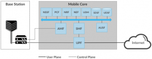 • UPF (User Plane Function): Forward lalu lintas antara RAN dan Internet, sesuai dengan kombinasi S/PGW di EPC. Selain forward paket, ia bertanggung jawab atas penegakan kebijakan, lawful intercept, pelaporan penggunaan lalu lintas, dan QoS policing.