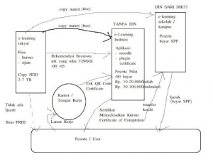 Mungkin ada baiknya kita melakukan explorasi bisnis proses belajar yang mungkin tidak terlalu konvensional. Bisnis proses ini merupakan pengalaman pribadi OWP dalam mengoperasikan e-learning rakyat di lms.onnocenter.or.id/moodle/ digambarkan dalam bentuk mind mapping di gambar. Mind mapping bisnis proses belajar ini difokuskan pada orang/siswa yang ingin menjadi pandai, yang ingin sukses di masa depannya terletak di bawah dari gambar. Sederhananya, tujuan yang ingin dicapai orang/siswa/mahasiswa tersebut,