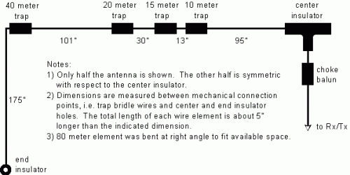 - fire safety - be certain your antenna design and construction are appropriate for the power level you intend to use. You don't want a trap or end insulator to catch fire in your attic! Both my experience and the amateur literature suggest that the antenna described here should safely accept 100 W if carefully constructed and installed.
