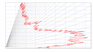 radiant lines adalah tanda sudut elevasi, di sini dalam half-degree-steps. Skala sumbu x dan sumbu y yang tidak sama (banyak-nya feet versus banyak-nya mil laut) menyebabkan jarak non-linier antara tanda sudut elevasi. Ketinggian ditampilkan sebagai pola kisi linier. Kisi kedua (bertitik) berorientasi pada kelengkungan bumi.