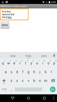 Trik multiline input box adalah men-set multiline property > true. Tambahkan kontrol tambahan untuk memberitahukan saat data entry selesai. Disini, kita menggunakan Tombol dan handle click event dengan memanggil HideKeyboard method dari TextBox1.