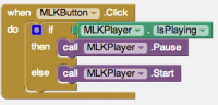 This behavior from the I Have a Dream app illustrates the fundamental way that an app makes decisions. There is a button with a picture of Martin Luther King on it. The action taken when the button is clicked is not always the same. If the sound file (MLK’s speech) is playing, it should be paused. If it is not playing, it should be started. The if-else block is used to branch based on the situation. It checks the IsPlaying property of the Player component. If it is true, it pauses the speech. If it is false (else), the speech is (re-) started.