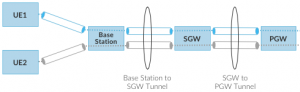- Ketiga, sementara user plane channel yang dihasilkan secara logis end-to-end, masing-masing sebenarnya diimplementasikan sebagai urutan tunnel per-hop, seperti yang diilustrasikan pada Gambar 17. (Gambar menunjukkan SGW dan PGW dari 4G Mobile Core untuk membuat contoh lebih konkrit.) Ini berarti setiap komponen pada jalur end-to-end mengakhiri downstream tunnel menggunakan satu pengenal lokal untuk UE tertentu, dan memulai upstream tunnel menggunakan pengenal lokal kedua untuk UE tersebut. Dalam praktiknya, tunnel per-flow ini sering digabungkan menjadi satu tunnel inter-component, yang membuat tidak mungkin untuk membedakan tingkat layanan yang diberikan ke end-to-end UE channel tertentu. Ini adalah batasan 4G yang ingin diperbaiki oleh 5G.