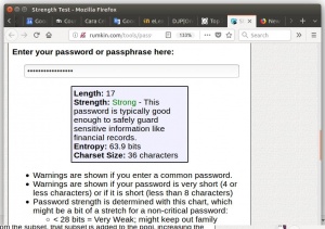 - Strength Test - http://rumkin.com/tools/password/passchk.php - Pemeriksa password ini akan mengukur password anda dan memberikan skor berdasarkan seberapa bagus password itu. Dia akan memberi tahu anda jika anda memilih password umum dan itu juga akan memperhitungkan kemungkinan huruf yang berdekatan satu sama lain. Misalnya, "Q" hampir selalu diikuti oleh "U", jadi skor password anda tidak akan bertambah banyak ketika anda mengetikkan "U".