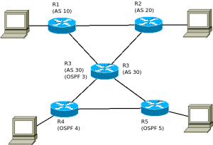 enable configure terminal ! ! area 0 = backbone router ospf 3 network 10.1.1.0 0.0.0.255 area 0.0.0.0 network 10.1.2.0 0.0.0.255 area 0.0.0.0 ! ! redistribute routing BGP redistribute bgp 30 subnets end