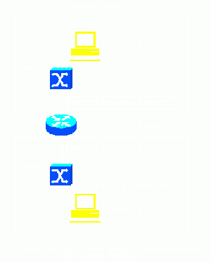 Gambar ini juga menunjukkan aliran tiga lapisan header untuk frame yang melintasi sambungan dari PC A ke PC B.