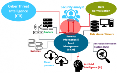 Diagram yang menunjukkan bagian-bagian yang membentuk SOC dan bagaimana mereka bekerja sama, termasuk cyber threat intelligence, normalisasi data, aplikasi SIEM, AI, dan security analysts.