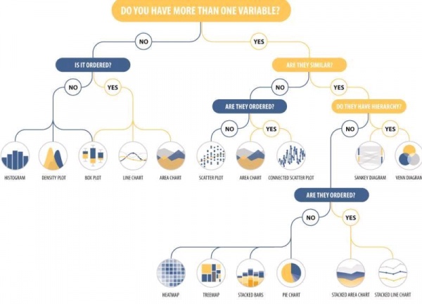 The figure is a decision tree for choosing the appropriate data visualization based on the number of variables and their characteristics. It helps in selecting the right type of chart or graph depending on whether the data is single-variable (univariate) or multi-variable (bivariate or multivariate).