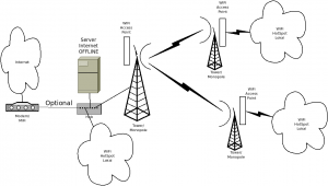 Agar siswa/mahasiswa yang tersebar dalam jarak yang agak jauh dari lokasi server Internet OFFLINE dapat mengakses server, kira perlu membuat sambungan jarak jauh, dan kemudian disebarkan ulang menggunakan WiFi HotSpot lokal. Sambungan jarak jauh dapat dibuat menggunakan dua antena wifi parabola yang diletakan di tiang/tower yang cukup tinggi.