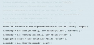 Cascading is neither a scripting nor a SQL-oriented language—it is a set of .jars that define data processing APIs, integration APIs, as well as a process planner and scheduler. As an abstraction of MapReduce, it may run slower than native Hadoop because of some overhead, but most developers don’t mind because its functions help complete projects faster, with less wasted time. For example, Cascading has a fail-fast planner which prevents it from running a Cascading Flow on the cluster if all the data/field dependencies are not satisfied in the Flow. It defines components and actions, sources, and output. As data goes from source to output, you apply a transformation, and we see an example of this below where lines, words, and counts are created and written to disk.