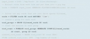 Apache Pig’s programming language, referred to as Pig Latin, provides a higher level of abstraction for MapReduce programming that is similar to SQL, but it is procedural code not declarative. It can be extended with User Defined Functions (UDFs) written in Java, Python, JavaScript, Ruby, or Groovy and includes tools for data execution, manipulation, and storage. In the example below, we can see Pig Latin used to describe the same word count application as above, but fewer lines of code are used to read, tokenize, filter, and count the data.