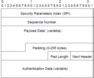 ESP menyediakan kerahasiaan, autentikasi, dan integritas data atau confidentiality, authentication dan data integrity. Dengan istilah “confidentiality”, kita maksudkan bahwa tidak ada orang lain, bahkan penerima yang dimaksud, dapat membaca konten komunikasi dalam perjalanan. Seperti yang sudah disebutkan untuk AH, ESP juga memberikan perlindungan anti-replay. Gambar di bawah menunjukkan format paket ESP: