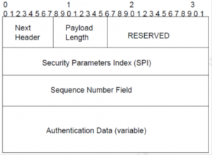 Dari gambar di atas, kita dapat melihat beberapa field yang berbeda. Field “Next Header” mengidentifikasi jenis protocol transport, seperti TCP. “Payload Length” mengidentifikasi panjang Header Otentikasi. Bidang SPI mengidentifikasi indeks parameter keamanan yang akan digunakan untuk mengidentifikasi SA. Field “Sequence Number” (SNF) adalah penghitung yang bertambah 1 saat pengirim atau penerima menerima atau mengirimkan data. Melalui SNF, perlindungan anti-replay disediakan, karena ketika penerima menerima paket dengan Field Sequence Number duplikat, ini dibuang (kita dapat melihat serangan "Session Replay" di IPv4).