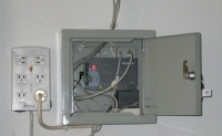 Pada gambar yang lain di perlihatkan isi dari kotak tempat penyimpanan hub, yang isinya hub dan power supply. Untuk menangkal petir, di sambungkan ke surge protector sebelum di masukan ke jaringan PLN.