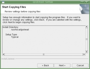 cp -Rf jPSKmail-0.5.1.0-Linux-x86-Install ~ cd ~ sudo chmod -Rf 777 jPSKmail-0.5.1.0-Linux-x86-Install sudo ./jPSKmail-0.5.1.0-Linux-x86-Install