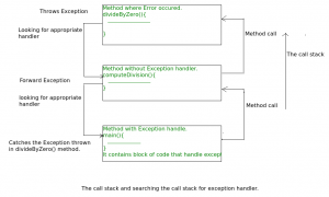 Default Exception Handling: Kapan pun di dalam suatu method, jika exception telah terjadi, method tersebut membuat Object yang dikenal sebagai Exception Object dan menyerahkannya ke run-time system (JVM). Exception object berisi nama dan deskripsi exception dan status program saat ini di mana exception telah terjadi. Membuat Exception Object dan menanganinya dalam run-time system disebut throwing an Exception. Mungkin ada daftar method yang dipanggil untuk sampai ke method di mana exception terjadi. Daftar method yang diurutkan ini disebut Call Stack. Selanjutnya, prosedur berikut akan terjadi.