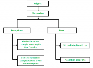Semua jenis exception dan error adalah subclass dari class Throwable, yang merupakan base class dari sebuah hirarki. Satu cabang adalah Exception. Class ini digunakan untuk kondisi luar biasa yang harus ditangkap oleh program. NullPointerException adalah contoh pengecualian semacam itu. Cabang lain, Error digunakan oleh Java run-time system (JVM) untuk menunjukkan error yang berkaitan dengan run-time environment itu sendiri (JRE). StackOverflowError adalah contoh error tersebut.
