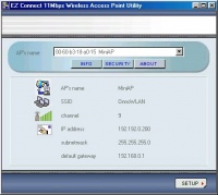 Pada saat kita masuk Access Point akan ditampilkan status Access Point, seperti ESSID, channel yang digunakan, IP addess dsb. Kita dapat dengan mudah mengubah konfigurasi dengan menekan tombol Setup yang tersedia di pojok sebelah kanan bawah.
