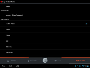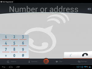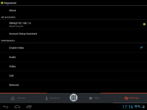 2.Setelah selesai ,buka linphone nya , dan klik pada menu settings yang ada pada pojok kanan bawah ,seperti pada gambar berikut :