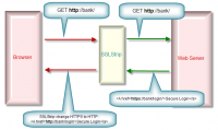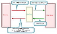 Pada gambar di atas korban mengakses web server bank dengan URL http://bank/. Request tidak secara langsung dikirim ke web server, namun melalui SSLStrip dulu. SSLStrip meneruskan request tersebut ke web server. Kemudian web server menjawab dengan memberikan html berisi link ke URL https://bank/login/ kepada SSLStrip. Sebelum response html diterima oleh browser, SSLStrip mengubah response tersebut dengan mengubah URL https menjadi http biasa sehingga HTML yang diterima di browser korban berisi link ke URL http://bank/login/ bukan https://bank/login/.