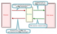 Setelah muncul halaman login dan korban mengira sedang membuka https://bank/login, kemudian korban memasukkan username dan password dan mengklik tombol Login. Browser akan membuat POST request ke http://bank/login/ yang diterima oleh SSLStrip. Karena protokolnya adalah http, maka SSLStrip dengan mudah bisa membaca username dan password yang dimasukkan korban. SSLStrip kemudian akan mengirimkan username dan password korban degan POST request ke https://bank/login/. Seperti biasa jawaban dari webserver akan dimodifikasi dulu seperlunya oleh SSLStrip sebelum dikirimkan ke browser korban.