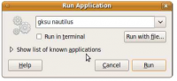 2. Dalam keadaan Home folder masih terbuka, tekan Alt+F2 ketikan gksu nautilus masukan password root.
