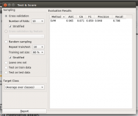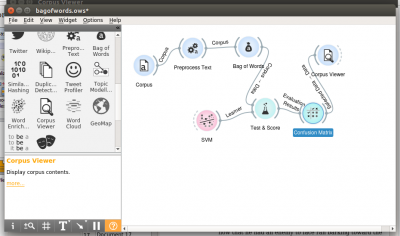 Workflow berikut memperlihatkan proses klasifikasi dokumen. Kita dapat menggunakan beberapa contoh yang ada di widget Corpus, seperti book-excerpt.tab. Untuk memudahkan proses klasifikasi, semua kata penghubung, tanda baca dibuang menggunakan widget Preprocess Text. Keluaran dari widget Preprocess Text dimasukan ke widget Bag of Words untuk menghitung (count) frekuensi istilah (term frequency) yang ada dalam dokumen. Selanjutnya di process pada widget Test & Score dengan learner yang kita pilih. Disini digunakan SVM. Hasilnya dapat kita lihat dalam widget Confusion Matrix, mana yang berhasil di klasifikasi dan mana yang tidak berhasil di klasifikasi. Kita dapat memilih, misalnya misclassified, dan menganalisanya di widget Corpus Viewer.