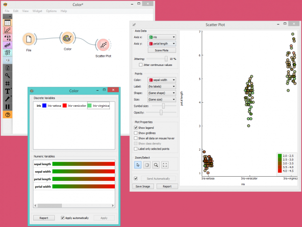 Kita memilih untuk bekerja dengan set data Iris. Kita membuka widget Color dan memilih tiga warna baru untuk tiga jenis Iris. Kemudian kita membuka widget Scatter Plot dan melihat perubahan yang dilakukan pada widget Scatter Plot.
