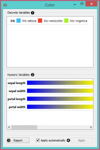 • A list of discrete variables. You can set the color of each variable by double-clicking on it and opening the Color palette or the Select color window. The widget also enables text-editing. By clicking on a variable, you can change its name.