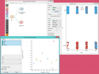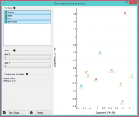 Di bawah, adalah perbandingan sederhana antara widget Correspondence Analysis dan Scatter Plot pada dataset Titanic. Sementara Scatter Plot menunjukkan dengan cukup baik kelas dan jenis kelamin mana yang memiliki tingkat kelangsungan hidup yang baik dan mana yang tidak, Correspondence Analysis dapat memplot beberapa variabel dalam grafik 2-D, sehingga memudahkan untuk melihat hubungan antara nilai-nilai variabel. Jelas dari grafik bahwa “no”, “male” dan “crew” terkait satu sama lain. Hal yang sama berlaku untuk “yes”, “female” dan “first”.